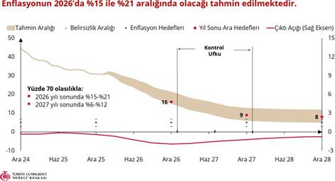 2026 yılının ilk Enflasyon Raporu sunumunda yer alan yukarıdaki grafikte de görüldüğü üzere 2026 için ara hedef %16 (tahmin aralığı %15-%21), 2027 yılı için ara hedef %9 (tahmin aralığı %6-%12) ve 2028 içinde ara hedef %8 olarak belirlenmiş durumda. Bu üç yılın ardından %5 olan ana hedefe ulaşmak istenmektedir.