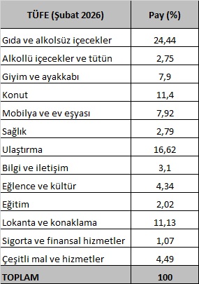 Aşağıdaki tabloda 2026 yılı itibariyle TÜİK tarafından hesaplanan hane halkı harcamalarında yer alan ana kalemler ve bu harcama gruplarının toplam harcamalar içinde aldığı pay görülmektedir. Bu tabloya göre 2026 yılında hane halkının her 100 TL’lik harcamasının 24,44 TL’si gıda ve alkolsüz içeceklere ayrılmaktadır. Dikkat edilirse burada yapılan harcamalar esas alınmakta, hane halkının gelirinin ne olduğuna bakılmamaktadır.