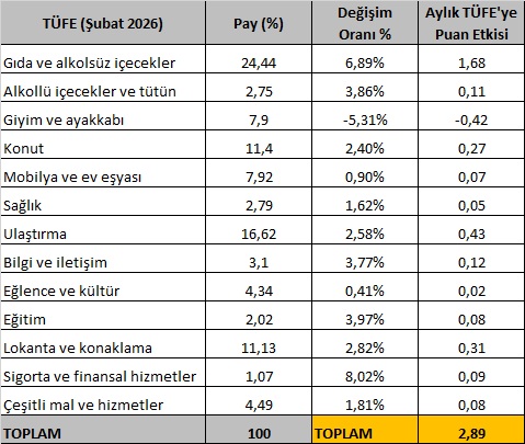 Aşağıdaki tabloda Şubat 2026 aylık TÜFE gerçekleşmesi görülmektedir. Tablodan gidecek olursak şubat ayında gıda ve alkolsüz içecekler kalemindeki ürünlerin ortalama fiyat artışı %6,89 olarak gerçekleşmiştir. Bu kalemin toplam TÜFE içindeki ağırlığı (24,44) ile değişim oranı (%6,89) çarpıldığında ortaya çıkan 1,68 bu kalemin aylık TÜFE’ye etkisini göstermektedir. Bu şekilde ortaya çıkan tüm kalemler toplandıktan sonra ortaya çıkan %2,89 kalemi ise TÜFE’nin şubat ayındaki aylık artış oranını vermektedir. Matematiksel olarak ifade edecek olursak TÜFE = Σ (Ağırlık × Fiyat Değişimi) olarak gösterilebilir.